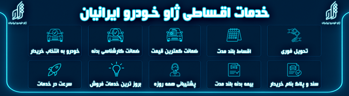 ژاو خودرو ایرانیان با سابقه طولانی در زمینه فروش اقساطی خودرو ، تجربهای مطمئن و شفاف را در اختیار مشتریان خود قرار میدهد . در ژاو خودرو ، فرآیند خرید با شرایط آسان و بازپرداخت یک الی پنج ساله فراهم شده است . تنوع بالای محصولات اعم از خودروهای داخلی و خارجی ، تحویل فوری همزمان با پیش پرداخت و همچنین پشتیبانی از روز تحویل تا اتمام اقساط، از جمله ویژگیهایی است که ژاو خودرو را به انتخابی مطمئن برای مشتریان تبدیل کرده است .