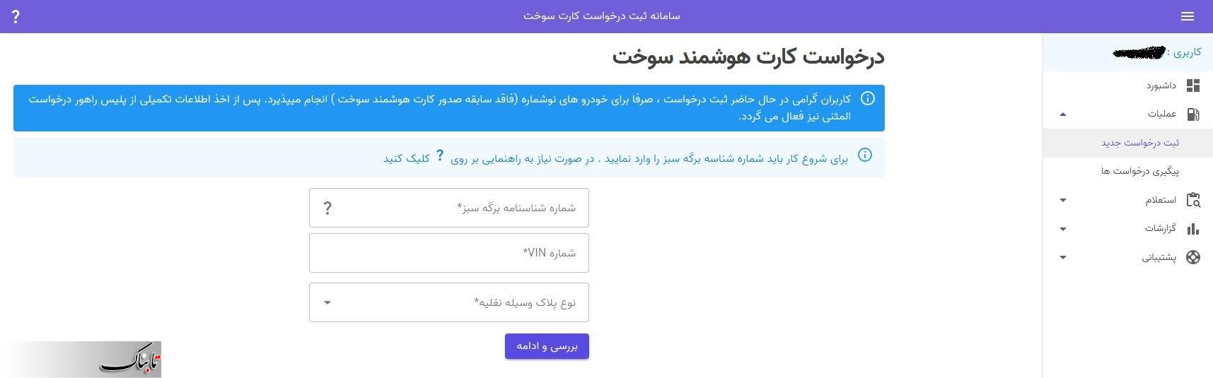 مرحله چهارم : با کلیک روی گزینه «عملیات» و «ثبت درخواست جدید» به صفحهای هدایت میشوید که در آن از شما خواسته میشود، شماره شناسه برگ سبز و نوع پلاک وسیله نقلیه را وارد کنید.